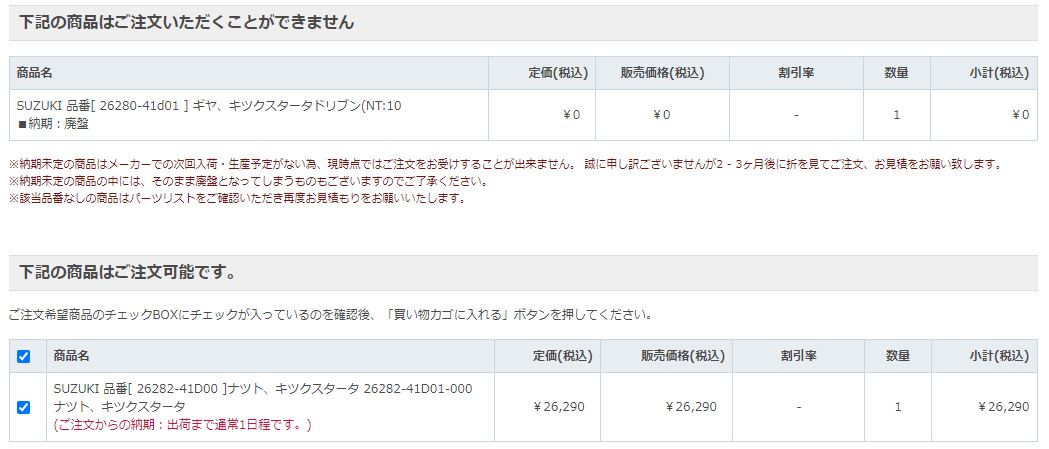 その後の純正部品在庫状況(2023年3月11日追記)